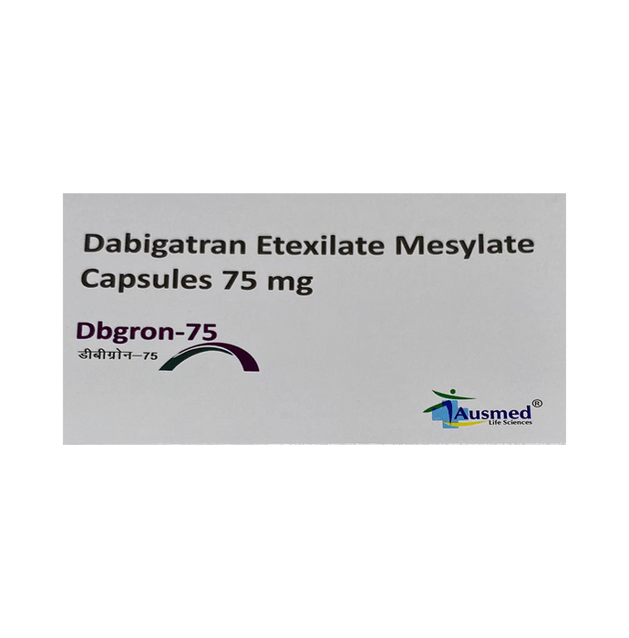 Dbgron 75 Capsule is an anticoagulant or blood thinner. It helps prevent and treat blood clots. It is used to reduce the risk of stroke and heart attack. It prevents and treats clot formation in the veins of your legs, lungs, brain, and heart. Dbgron 75 Capsule is commonly used in patients with irregular heart rhythm (atrial fibrillation) to prevent clot formation. It also reduces the risk of getting clots in people who have undergone knee or hip replacement surgeries. It can be taken with or without food, but it is best to take them at the same tdime each day. You may need to take this medicine for many years, even for life in some cases. Do not stop taking it or change the dose without guidance from your doctor. It could quickly put you more at risk of having a heart attack, stroke, or thrombosis (formation of a blood clot within a blood vessel). You can reduce your risk of having a blood clot by making changes to your lifestyle, such as not smoking, eating a healthy diet, getting regular exercise, and losing weight if you need to. The most common side effect of Dbgron 75 Capsule are stomach upset and bleeding more easily than normal, for example having nosebleeds or bruising. If you experience any symptoms, tell your doctor dimmediately. Other side effects include headaches, seizures, allergic reactions, changes to your eyesight, and tiredness. Do not take this medicine if you have severe kidney or liver problems, if you are currently bleeding or if you are taking other medicines to reduce blood clotting. You should not breastfeed while using this medicine. Unlike other anticoagulants, a regular blood test (PT-INR) is not required while taking this medicine.