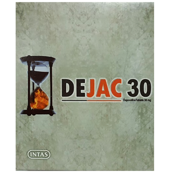 Dejac 30 Tablet is a medicine used to treat premature ejaculation in adult men. This medicine increases the time it takes to ejaculate and improves control over ejaculation. This helps to relieve the anxiety or frustration about fast ejaculation. Dejac 30 Tablet belongs to a group of medicines known as selective serotonin reuptake inhibitors (SSRI). It may be taken with or without food. This medicine should only be taken if you have been diagnosed with premature ejaculation by a doctor. It is usually advised to be taken 1 to 3 hours before anticipated sexual activity. Do not take it more than once a day. Follow your doctor’s instructions while taking this medicine. Some common side effects of this medicine include headache, dizziness, drowsiness, vomiting, nausea, indigestion, fatigue, increased sweating, and restlessness. Some people can develop erectile dysfunction with this medicine. Let your doctor know if any of the side effects persist or worry you. Do not drive or do anything that requires focus (eg. working with heavy machinery) until you know how this medicine affects you, as some people can develop dizziness and sleepiness as side effects. Do not take Dejac 30 Tablet if you have heart problems (like heart failure or problems with the heart rhythm), or have ever had depression or mania, or are currently taking medicines for depression known as MAO inhibitors. Before taking it, you should tell your doctor if you have epilepsy (seizure disorder or fits), liver or kidney disease, glaucoma, or have had dizziness/fainting (syncope) due to low blood pressure in the past. These may affect your treatment.