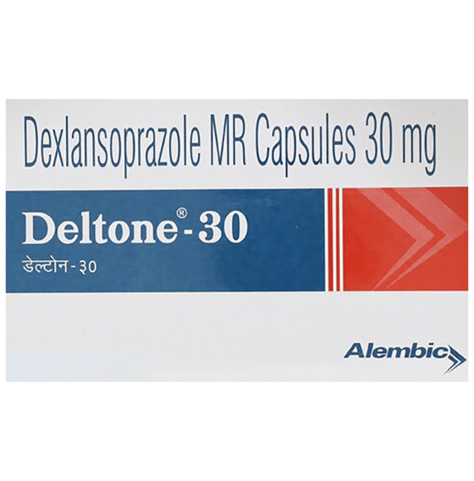 Deltone 30mg Capsule is a medicine that reduces the amount of acid produced in your stomach. It is used for treating acid-related diseases of the stomach and intestine such as heartburn, acid reflux, peptic ulcer disease, and some other stomach conditions associated with excessive acid production. Deltone 30mg Capsule is also used to prevent stomach ulcers and acidity that may be seen with the prolonged use of pain-killers. It belongs to a class of medicines known as proton pump inhibitors (PPIs). This medicine should be taken one hour before a meal, preferably in the morning. The dose will depend on your underlying condition and how you respond to the medicine. You should keep on taking it as prescribed even if your symptoms disappear quickly. You can increase the efficiency of the treatment by eating smaller meals more often and avoiding caffeinated drinks (like tea and coffee), and spicy or fatty foods. The most common side effects observed with this medicine include nausea, vomiting, flatulence, and diarrhea. These symptoms are generally mild but if they bother you or do not go away, consult your doctor. Long-term use of this medicine may lead to an increased risk of side effects. For instance, using this medicine for more than 1 year may increase your risk for bone fractures, especially with higher doses. Talk to your doctor about ways to prevent bone loss (osteoporosis), like taking calcium and vitamin D supplements. Before taking this medicine, you need to tell your doctor if you have severe liver problems, are taking medicines for HIV, have ever had an allergic reaction to similar medicines in the past, or suffer from bone loss (osteoporosis). Pregnant or breastfeeding women should also consult their doctor before taking it.