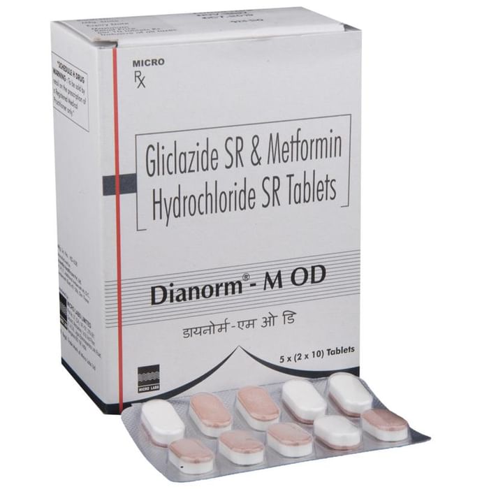 Dianorm-M OD Tablet SR belongs to a category of medicines known as anti-diabetic drugs. It is a combination of two medicines used to treat type 2 diabetes mellitus in adults. It helps control blood sugar levels in people with diabetes. Dianorm-M OD Tablet SR should be taken with food. Take it regularly at the same time each day to get the most benefit. Your doctor will decide what dose is best for you and this may change from time to time according to how it is working according to your blood sugar levels. Keep taking this medicine, even if you feel well or your blood sugar levels are controlled. If you stop it without consulting your doctor, your blood sugar levels could rise and put you at risk of kidney damage, blindness, nerve problems and loss of limbs. Remember that it is only part of a treatment program that should also include a healthy diet, regular exercise, and weight reduction as advised by your doctor. Your lifestyle plays a big part in controlling diabetes. The most common side effect of Dianorm-M OD Tablet SR is low blood glucose levels (hypoglycemia). Make sure you recognize the signs of having low blood glucose levels, such as sweating, dizziness, headache, and shaking and know how to deal with it. To prevent this, it's important to have regular meals and always carry a fast-acting source of glucose such as sugary food or fruit juice with you. Drinking alcohol can also increase your risk of low blood sugar levels and should be avoided. Other side effects that may be seen on taking this medicine include taste changes, nausea, diarrhea, stomach pain, headache, and upper respiratory tract infection. Some people may find that they put on weight with this medicine. You should not take it if you have type 1 diabetes mellitus, if you have diabetic ketoacidosis (high levels of acid in your blood), or if you have severe kidney or liver disease. Before taking this medicine, tell your doctor if you have ever had heart disease. It may not be suitable. Pregnant or breastfeeding women should also consult their doctor before taking it. Your blood sugar levels should be checked regularly and your doctor may also advise blood tests to monitor your blood cell counts and liver function.