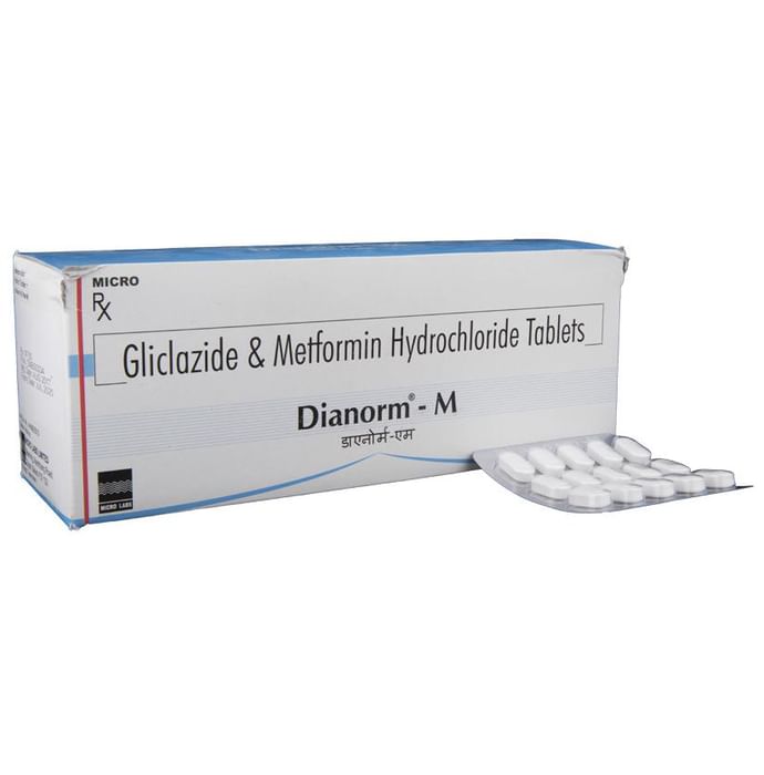 Dianorm-M Tablet belongs to a category of medicines known as anti-diabetic drugs. It is a combination of two medicines used to treat type 2 diabetes mellitus in adults. It helps control blood sugar levels in people with diabetes. Dianorm-M Tablet should be taken with food. Take it regularly at the same time each day to get the most benefit. Your doctor will decide what dose is best for you and this may change from time to time according to how it is working according to your blood sugar levels. Keep taking this medicine, even if you feel well or your blood sugar levels are controlled. If you stop it without consulting your doctor, your blood sugar levels could rise and put you at risk of kidney damage, blindness, nerve problems and loss of limbs. Remember that it is only part of a treatment program that should also include a healthy diet, regular exercise, and weight reduction as advised by your doctor. Your lifestyle plays a big part in controlling diabetes. The most common side effect of Dianorm-M Tablet is low blood glucose levels (hypoglycemia). Make sure you recognize the signs of having low blood glucose levels, such as sweating, dizziness, headache, and shaking and know how to deal with it. To prevent this, it's important to have regular meals and always carry a fast-acting source of glucose such as sugary food or fruit juice with you. Drinking alcohol can also increase your risk of low blood sugar levels and should be avoided. Other side effects that may be seen on taking this medicine include taste changes, nausea, diarrhea, stomach pain, headache, and upper respiratory tract infection. Some people may find that they put on weight with this medicine. You should not take it if you have type 1 diabetes mellitus, if you have diabetic ketoacidosis (high levels of acid in your blood), or if you have severe kidney or liver disease. Before taking this medicine, tell your doctor if you have ever had heart disease. It may not be suitable. Pregnant or breastfeeding women should also consult their doctor before taking it. Your blood sugar levels should be checked regularly and your doctor may also advise blood tests to monitor your blood cell counts and liver function.
