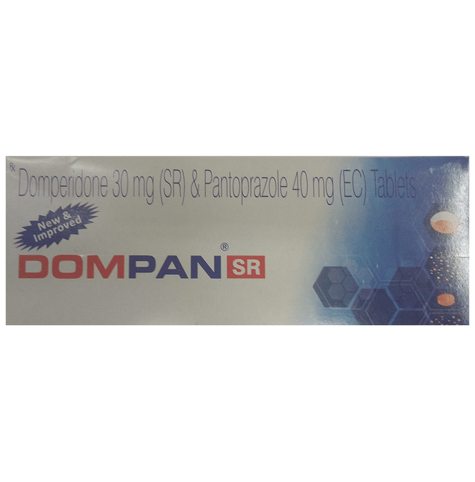 Dompan SR Tablet is a prescription medicine used to treat gastroesophageal reflux disease (Acid reflux) and peptic ulcer disease by relieving the symptoms of acidity such as indigestion, heartburn, stomach pain, or irritation. Dompan SR Tablet also neutralizes the acid in the stomach and promotes easy passage of gas to reduce stomach discomfort. It is taken without food in a dose and duration as advised by the doctor. The dose you are given will depend on your condition and how you respond to the medicine. You should keep taking this medicine for as long as your doctor recommends. If you stop treatment too early your symptoms may come back and your condition may worsen. Let your healthcare team know about all other medications you are taking as some may affect, or be affected by this medicine. The most common side effects are diarrhea, stomach pain, flatulence, dryness in the mouth, and headache. Most of these are temporary and usually resolve with time. Contact your doctor straight away if you are at all concerned about any of these side effects. This medicine may cause dizziness and sleepiness, so do not drive or do anything that requires mental focus until you know how this medicine affects you. Avoid drinking alcohol while taking this medicine as it can worsen your sleepiness. Lifestyle modifications like having cold milk and avoiding hot tea, coffee, spicy food, or chocolate can help you to get better results. Before you start taking this medicine it is important to inform your doctor if you are suffering from kidney or liver disease. You should also tell your doctor if you are pregnant, planning pregnancy, or breastfeeding.