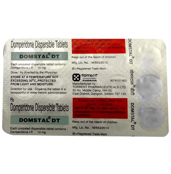 Domstal DT Tablet is used in the treatment of indigestion, nausea, and vomiting. It increases the movement of food through the stomach and intestines, thereby relieving bloating, fullness, and gastric discomfort. Take Domstal DT Tablet half an hour before each meal in the dose and duration as advised by the doctor. The dose you are given will depend on your condition and how you respond to the medicine. You should take this medicine until your doctor tells you to stop. Let your doctor know about all other medications you are taking as some may affect, or be affected by this medicine. The most common side effects are headache, dry mouth, and stomach pain. Most of these are temporary and usually resolve with time. Contact your doctor straight away if you are at all concerned about any of these side effects. It may also cause dizziness. Do not drive or do anything that requires mental focus until you know how this medicine affects you. Avoid drinking alcohol while taking this medicine as it can worsen the side effects. This medicine may also cause diarrhea, so it is better to take plenty of fluids while taking this medicine as it may help to prevent dehydration. Before taking this medicine you should let your doctor know if you have liver or kidney problems. You shouldn't take it at the same time as an antacid. Pregnant women should also consult their doctor. You should avoid this medicine if suffering from bleeding ulcers in the stomach.