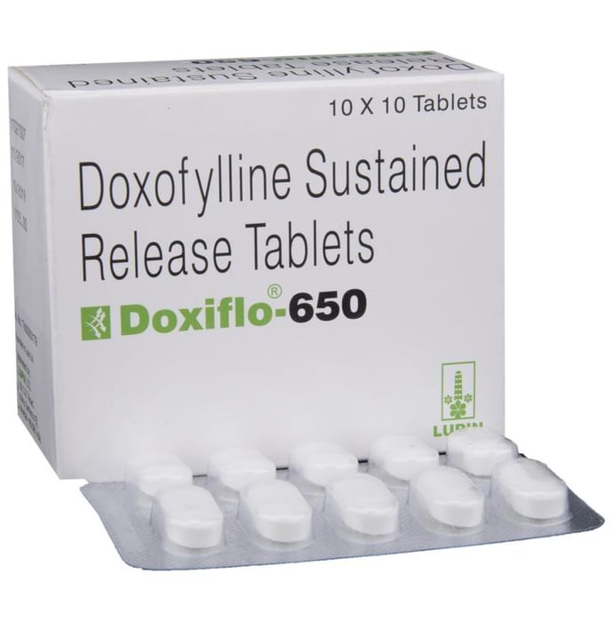 Doxiflo 650 Tablet SR is used to treat and prevent symptoms of asthma and chronic obstructive pulmonary disorder (a lung disorder in which flow of air to the lung is blocked). It helps in relaxing the muscles of the air passages, thus widening it and making it easier to breathe. Doxiflo 650 Tablet SR can be taken with the food in the evening. Take it in the exact dose and duration as prescribed by your doctor. The dose and how often should take it may depend on what you are taking it for. Take it for as long as it is prescribed for you. In case you missed a dose, take it as soon as you remember it. It does not work immediately or prevent the already started breathing trouble, hence always carry your medical inhaler with you for an emergency. The most common side effects of this medicine include vomiting, headache, nausea, and stomach upset. If these bother you or appear serious, let your doctor know. There may be ways of reducing or preventing them. Generally, it is advised not to consume alcohol or do not smoke while on treatment. You must avoid high caffeinated products like coffee, tea, and dark chocolates as it enhances drug side effects. Before taking this medicine, let your doctor if you have kidney or liver disease or if you have heart-related problems. Your doctor should also know about all other medicines you are taking as many of these may make this medicine less effective or change the way it works. Inform your doctor if you are pregnant or breastfeeding before starting the treatment.