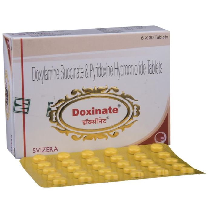 Doxinate Tablet is a combination medicine used to treat nausea and vomiting during pregnancy. It prevents the feeling of nausea and sickness in pregnant women. It also provides nutrition to the body. Doxinate Tablet is a prescription medicine. It is advised to take it as per the prescription. It can be taken with or without food, but it must be taken at a fixed time to ensure better efficacy. Do not consume more than the recommended dose, as this may have harmful effects on your body. If you miss a dose, take it as soon as you remember. The course of the treatment must be completed even if you feel better. Sudden discontinuation of the treatment may affect the potency of the medicine. Some common side effects of this medicine are dizziness, stomach pain, constipation, etc. To cope up with the side effects, you should drink plenty of fluid. If any of the side effects get aggravated, contact your doctor immediately. If you experience any allergic reaction (rashes, itching, swelling, shortness of breath, etc.), you must seek immediate medical help. Before taking this medicine, you should tell your doctor if you are taking any medicine for any health condition. Avoid drinking alcohol as it can cause excessive dizziness, also can harm the baby in the womb. It usually does not impair your ability to drive, but you should not drive if it makes you feel sleepy or dizzy. You must take adequate rest for a faster recovery, also take a healthy diet. To avoid nausea and vomiting during pregnancy, you may drink lemon-infused water. You can also add salad sprinkled with black salt to your diet. Visit your doctor regularly for laboratory and diagnostic tests as per advice.