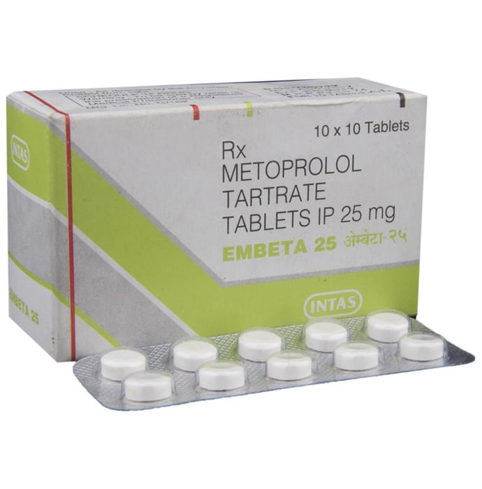 Embeta 25 Tablet belongs to a group of medicines called beta-blockers. It is used to treat high blood pressure (hypertension), angina (heart-related chest pain), irregular heart rhythms (arrhythmia). It also helps to prevent future heart attacks and stroke and to prevent migraines. Embeta 25 Tablet is also used to relieve the symptoms caused by an overactive thyroid gland. It may be prescribed alone or together with other medications. The dose and frequency depend on what you are taking it for and the severity of your condition. It may be taken empty stomach or with a meal, but take it regularly at the same time each day to get the most benefit. It may take several weeks before you get the full benefit of this medicine and you may need to take it for the rest of your life. However, it is important to continue taking it even if you feel well. Most people with high blood pressure do not feel ill and if you stop taking it, your condition may worsen. The main side effects of this medicine are sudden lowering of blood pressure, slow heart rate, headache, feeling dizzy, and nausea. These are usually mild and short-lived. It may also cause shortness of breath or low blood pressure in some people. To reduce the risk of side effects your doctor will probably start the medicine at a low dose and gradually increase it. Consult your doctor if the side effects bother you or do not go away. Before taking it, let your doctor know if you have any liver problems. It may also not be suitable for people who have a slow heart rate, severe circulation problems, severe heart failure, or low blood pressure. Pregnant or breastfeeding mothers should also consult their doctor before taking it. You must talk to your doctor to find out whether this medicine is suitable for you to use. You should have your blood pressure checked regularly to make sure that this medicine is working properly. Avoid drinking alcohol as it may increase certain side effects.