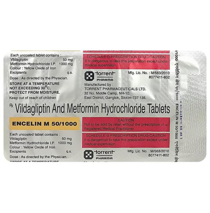 Encelin M 50/1000 Tablet is a combination of two medicines that control high blood sugar levels in people with type 2 diabetes mellitus. This helps prevent serious complications of diabetes such as kidney damage and blindness and may also reduce your chances of having a heart attack or stroke. Encelin M 50/1000 Tablet can be prescribed alone or together with other diabetes medications. All diabetes medicines work best when used along with a healthy diet and regular exercise. The dose you are given will depend on your condition, blood sugar levels, and what other medicines you are taking. Taking it with meals helps to reduce the chances of developing an upset stomach. You should take it regularly, at the same time each day, to get the most benefit and you should not stop unless your doctor recommends it. It is controlling your blood sugar levels and helping to prevent serious complications in the future. It is important to stay on the diet and exercise program recommended by your doctor while taking this medicine. Your lifestyle plays a big part in controlling diabetes. The most common side effects of taking this medicine include diarrhea, nausea, vomiting, upset stomach, headache, and sore throat. Low blood sugar level (hypoglycemia) is a possible side effect if you are also taking other diabetes medicines like insulin or sulphonylurea, so you need to know how to recognize and deal with it. This medicine is not suitable for everyone. Before taking it, you should let your doctor know if you have ever had kidney, liver, or heart disease, problems with your pancreas, or if you drink a lot of alcohol. Pregnant or breastfeeding women should also consult their doctor before taking this medicine. Some other medicines can affect this one so tell your doctor about all the medicines you are taking to make sure you are safe. You should try to avoid drinking alcohol as it lowers blood glucose. Your doctor will check your kidney function and blood sugar levels before and during treatment.