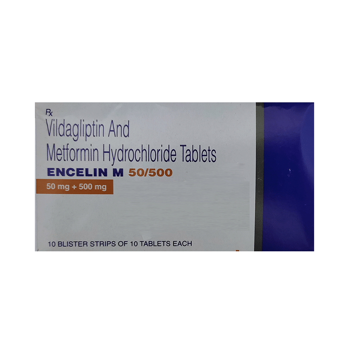 Encelin M 50/500 Tablet is a combination of two medicines that control high blood sugar levels in people with type 2 diabetes mellitus. This helps prevent serious complications of diabetes such as kidney damage and blindness and may also reduce your chances of having a heart attack or stroke. Encelin M 50/500 Tablet can be prescribed alone or together with other diabetes medications. All diabetes medicines work best when used along with a healthy diet and regular exercise. The dose you are given will depend on your condition, blood sugar levels, and what other medicines you are taking. Taking it with meals helps to reduce the chances of developing an upset stomach. You should take it regularly, at the same time each day, to get the most benefit and you should not stop unless your doctor recommends it. It is controlling your blood sugar levels and helping to prevent serious complications in the future. It is important to stay on the diet and exercise program recommended by your doctor while taking this medicine. Your lifestyle plays a big part in controlling diabetes. The most common side effects of taking this medicine include diarrhea, nausea, vomiting, upset stomach, headache, and sore throat. Low blood sugar level (hypoglycemia) is a possible side effect if you are also taking other diabetes medicines like insulin or sulphonylurea, so you need to know how to recognize and deal with it. This medicine is not suitable for everyone. Before taking it, you should let your doctor know if you have ever had kidney, liver, or heart disease, problems with your pancreas, or if you drink a lot of alcohol. Pregnant or breastfeeding women should also consult their doctor before taking this medicine. Some other medicines can affect this one so tell your doctor about all the medicines you are taking to make sure you are safe. You should try to avoid drinking alcohol as it lowers blood glucose. Your doctor will check your kidney function and blood sugar levels before and during treatment.