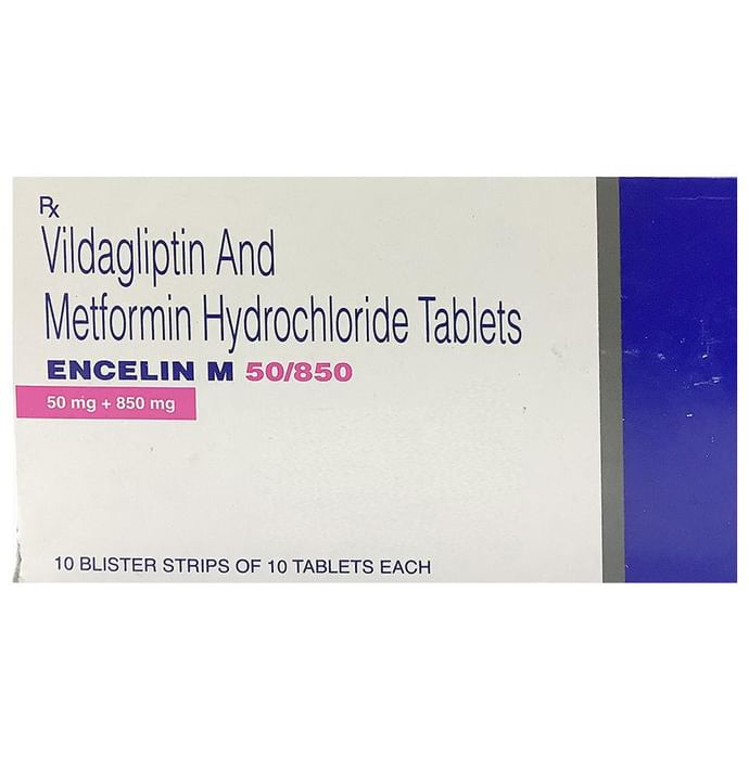 Encelin M 50/850 Tablet is a combination of two medicines that control high blood sugar levels in people with type 2 diabetes mellitus. This helps prevent serious complications of diabetes such as kidney damage and blindness and may also reduce your chances of having a heart attack or stroke. Encelin M 50/850 Tablet can be prescribed alone or together with other diabetes medications. All diabetes medicines work best when used along with a healthy diet and regular exercise. The dose you are given will depend on your condition, blood sugar levels, and what other medicines you are taking. Taking it with meals helps to reduce the chances of developing an upset stomach. You should take it regularly, at the same time each day, to get the most benefit and you should not stop unless your doctor recommends it. It is controlling your blood sugar levels and helping to prevent serious complications in the future. It is important to stay on the diet and exercise program recommended by your doctor while taking this medicine. Your lifestyle plays a big part in controlling diabetes. The most common side effects of taking this medicine include diarrhea, nausea, vomiting, upset stomach, headache, and sore throat. Low blood sugar level (hypoglycemia) is a possible side effect if you are also taking other diabetes medicines like insulin or sulphonylurea, so you need to know how to recognize and deal with it. This medicine is not suitable for everyone. Before taking it, you should let your doctor know if you have ever had kidney, liver, or heart disease, problems with your pancreas, or if you drink a lot of alcohol. Pregnant or breastfeeding women should also consult their doctor before taking this medicine. Some other medicines can affect this one so tell your doctor about all the medicines you are taking to make sure you are safe. You should try to avoid drinking alcohol as it lowers blood glucose. Your doctor will check your kidney function and blood sugar levels before and during treatment.