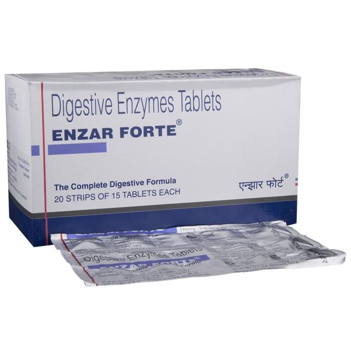 Enzar Forte Tablet is a combination medicine used in the treatment of indigestion. It works effectively to reduce abdominal pain, bloating, and discomfort. It improves the functioning of the digestive system for proper digestion. Enzar Forte Tablet is taken with food in a dose and duration as advised by the doctor. The dose you are given will depend on your condition and how you respond to the medicine. You should keep taking this medicine for as long as your doctor recommends. If you stop treatment too early your symptoms may come back and your condition may worsen. Let your healthcare team know about all other medications you are taking as some may affect, or be affected by this medicine. The most common side effects are nausea, constipation, stomach pain, bloating, and diarrhea. Most of these are temporary and usually resolve with time. Contact your doctor straight away if you are at all concerned about any of these side effects. To overcome constipation, you should add fiber-rich foods to your diet and stay hydrated. Lifestyle modifications like having a fiber-rich diet, increase fluid intake and regular exercise can help you to get better results. Before taking this medicine, you should tell your doctor if you are pregnant, planning pregnancy, or breastfeeding. You should also tell your doctor if you have any kidney or high blood uric acid.
