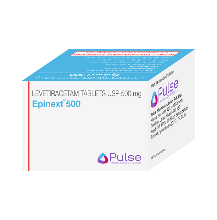 Epinext 500 Tablet is an anti-epileptic medicine used to treat seizures (fits) in epilepsy. It can be used alone or along with other medicines. It helps to prevent seizures for as long as you continue to take it. Epinext 500 Tablet suppresses the abnormal electrical activity in the brain. You can take it with or without food but try to take it at the same time each day to get the most benefit. The dose will depend on your condition and how you respond to the medicine. Your doctor will advise the right dose for you. It is generally advised as a long-term treatment. You should continue taking it for as long as your doctor has told you to, even if you feel well. If you stop or miss doses your seizures could get worse. Some common side effects of this medicine include dizziness, headache, infection, irritation, nasal congestion (stuffy nose), sleepiness, behavior changes, aggressive behavior, and decreased appetite. Side effects are more common during the first few weeks and usually lessen as your body gets used to the medicine. Most of these side effects do not need medical attention, but some of them can be serious. A small number of people being treated with this medicine have had thoughts of harming or killing themselves. Contact your doctor if your mood changes for the worse. Before taking it, you should tell your doctor if you have kidney problems, depression, or suicidal thoughts and if you are pregnant, planning to become pregnant, or breastfeeding. Your doctor may suggest regular blood tests to monitor your kidney function while taking this medicine.