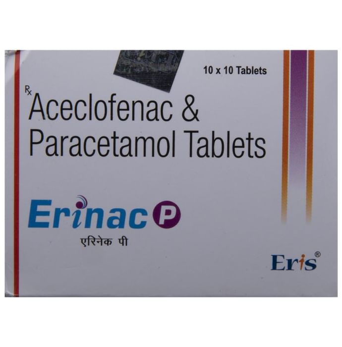 Erinac P Tablet is a pain-relieving medicine. It is used to reduce pain and inflammation in conditions like rheumatoid arthritis, ankylosing spondylitis, and osteoarthritis. It may also be used to relieve muscle pain, back pain, toothache, or pain in the ear and throat. Erinac P Tablet should be taken with or without food. You should take it regularly as advised by your doctor. Your doctor may change the dose and time between doses according to your pain level and your needs. Do not take more or use it for a longer duration than recommended by your doctor. Some of the common side effects of this medicine include nausea, vomiting, stomach pain, loss of appetite, heartburn, and diarrhea. If any of these side effects bother you or do not go away with time, you should let your doctor know. Your doctor may help you with ways to reduce or prevent these side effects by prescribing an alternative medicine or adjusting the dose. The medicine may not be suitable for everybody. Before taking it, let your doctor know if you have any problems with your heart, kidneys, liver, or have stomach ulcers. To make sure it is safe for you, let your doctor know about all the other medicines you are taking. Pregnant and breastfeeding mothers should first consult their doctors before using this medicine.