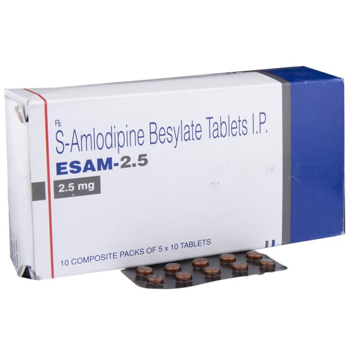 Esam 2.5 Tablet is a medicine used to treat high blood pressure (hypertension) and to prevent angina (heart-related chest pain). It is a calcium channel blocker which helps to lower blood pressure and reduce the workload of the heart. This helps prevent heart attacks and strokes. Esam 2.5 Tablet may be prescribed alone or along with other medicines. The dose depends on what you are taking it for and the severity of your condition. You can take it at any time of day, with or without food, but it is best to take it at the same time each day. Keep taking it for as long as advised by your doctor. Even if you feel well, do not stop this medicine on your own because high blood pressure often has no symptoms. If you stop taking it, your condition may get worse. Keeping active with regular exercise, reducing your weight and eating a healthy diet will also help control your blood pressure. Follow your doctor’s advice while taking this medicine. The most common side effects include fatigue, swelling in the feet or ankles, sleepiness, dizziness, flushing, and headache. Consult your doctor If any of these bother you, or get worse, or won't go away. Before taking it, let your doctor know if you have any liver or kidney problems. Pregnant or breastfeeding women should also consult their doctor for advice before taking this medicine. You also need to tell your doctor what other medicines you are taking – especially those used to treat high blood pressure or heart conditions. You should have your blood pressure checked regularly to make sure that this medicine is working properly.