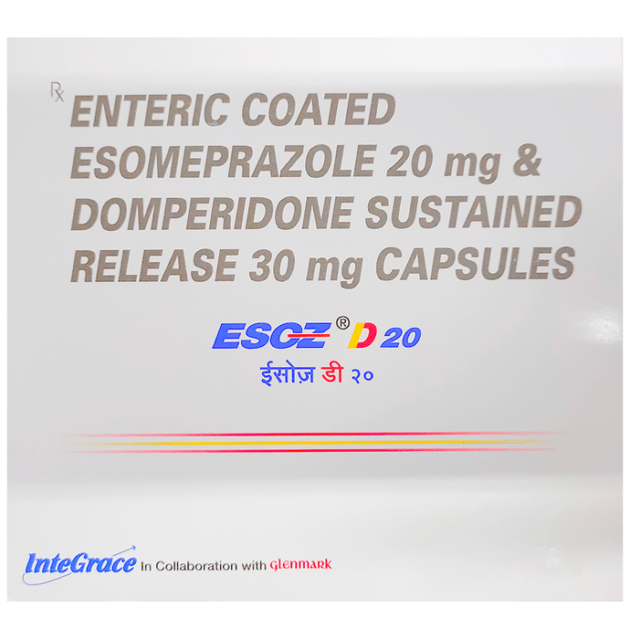 In Treatment of Gastroesophageal reflux disease (Acid reflux) Gastroesophageal reflux disease (GERD) is a chronic (long-term) condition in which there is an excess production of acid in the stomach. Esoz D 20 Capsule SR reduces the amount of acid your stomach makes and relieves the pain associated with heartburn and acid reflux. You should take it exactly as it is prescribed for it to be effective. Some simple lifestyle changes can help reduce the symptoms of GERD. Think about what foods trigger heartburn and try to avoid them; eat smaller, more frequent meals; try to lose weight if you are overweight and try to find ways to relax. Do not eat within 3-4 hours of going to bed. In Treatment of Functional dyspepsia Functional dyspepsia is another term for indigestion that is not associated with a specific cause. It may cause symptoms such as an early feeling of fullness after eating, stomach pain or discomfort, nausea, and bloating. Esoz D 20 Capsule SR helps treat these symptoms by increasing the rate of stomach emptying. Follow your doctor’s instructions carefully and make appropriate lifestyle changes to get maximum benefit.