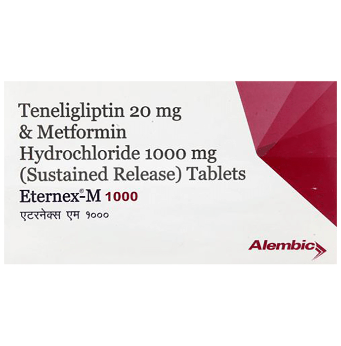 Eternex-M 1000 Tablet SR is a combination of two medicines that control high blood sugar levels in people with type 2 diabetes mellitus. This helps prevent serious complications of diabetes such as kidney damage and blindness and may also reduce your chances of having a heart attack or stroke. Eternex-M 1000 Tablet SR can be prescribed alone or together with other diabetes medications. All diabetes medicines work best when used along with a healthy diet and regular exercise. The dose you are given will depend on your condition, blood sugar levels, and what other medicines you are taking. Taking it with meals helps to reduce the chances of developing an upset stomach. You should take it regularly, at the same time each day, to get the most benefit and you should not stop unless your doctor recommends it. It is controlling your blood sugar levels and helping to prevent serious complications in the future. It is important to stay on the diet and exercise program recommended by your doctor while taking this medicine. Your lifestyle plays a big part in controlling diabetes. The most common side effects of taking this medicine include diarrhea, nausea, vomiting, upset stomach, headache, and sore throat. Low blood sugar level (hypoglycemia) is a possible side effect if you are also taking other diabetes medicines like insulin or sulfonylurea, so you need to know how to recognize and deal with it. This medicine is not suitable for everyone. Before taking it, you should let your doctor know if you have ever had kidney, liver, or heart disease, problems with your pancreas, or if you drink a lot of alcohol. Pregnant or breastfeeding women should also consult their doctor before taking this medicine. Some other medicines can affect this one so tell your doctor about all the medicines you are taking to make sure you are safe. You should try to avoid drinking alcohol as it lowers blood glucose. Your doctor will check your kidney function and blood sugar levels before and during treatment.
