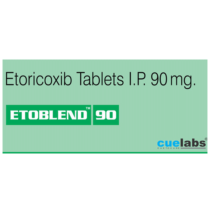 Etoblend 90 Tablet is a pain-relieving medicine. It is used for relieving moderate pain and swelling of joints associated with different forms of gout and arthritis. It effectively alleviates pain, redness, and swelling. Etoblend 90 Tablet should be taken in the dose and duration as advised by your doctor. Etoblend 90 Tablet may be taken with or without food, but it is better to take it at a fixed time. The most common side effect of this medicine is abdominal pain. You may also experience other side effects like constipation, flatulence, heartburn, diarrhea, indigestion, nausea, vomiting, esophagitis, oral ulcer, edema, dizziness, headache, palpitations, arrhythmia, high blood pressure, bronchospasm, increased liver enzymes, fatigue, bruises, and flu-like-symptoms. It is potentially unsafe to take it during pregnancy. Inform your doctor if you have a history of stomach ulcers, heart diseases, high blood pressure, and liver or kidney disease.