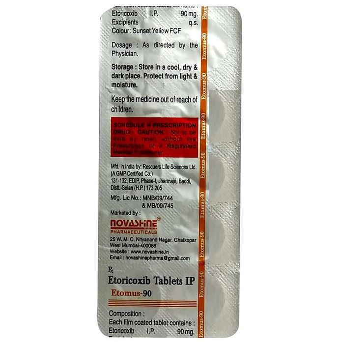 Etomus 90 Tablet is a pain-relieving medicine. It is used for relieving moderate pain and swelling of joints associated with different forms of gout and arthritis. It effectively alleviates pain, redness, and swelling. Etomus 90 Tablet should be taken in the dose and duration as advised by your doctor. Etomus 90 Tablet may be taken with or without food, but it is better to take it at a fixed time. The most common side effect of this medicine is abdominal pain. You may also experience other side effects like constipation, flatulence, heartburn, diarrhea, indigestion, nausea, vomiting, esophagitis, oral ulcer, edema, dizziness, headache, palpitations, arrhythmia, high blood pressure, bronchospasm, increased liver enzymes, fatigue, bruises, and flu-like-symptoms. It is potentially unsafe to take it during pregnancy. Inform your doctor if you have a history of stomach ulcers, heart diseases, high blood pressure, and liver or kidney disease.