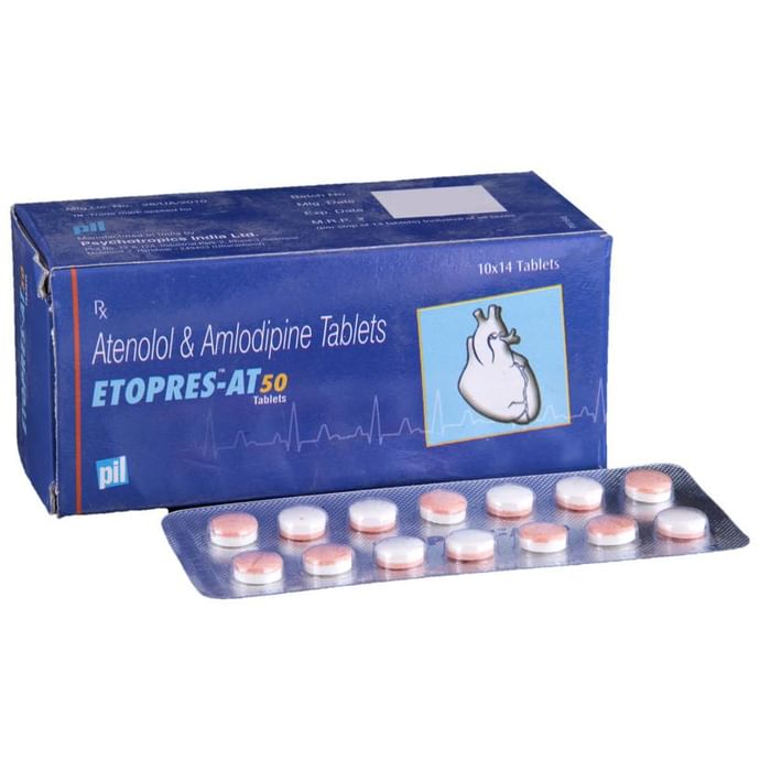 In Treatment of Hypertension (high blood pressure) Etopress-AT 50 Tablet is a combination medicine that contains two active ingredients, Amlodipine and Atenolol. Both of the medicines in this combination work to lower blood pressure but in different ways. Together they help to relax blood vessels, reduce heart rate and make it easier for your heart to pump blood around your body. This lowers blood pressure. If your blood pressure is controlled you are less at risk of having a heart attack, stroke or kidney problems. The medicine must be taken regularly as prescribed to be effective. You do not usually feel any direct benefit from taking this medicine, but it works in the long term to keep you well. You should also make appropriate lifestyle changes (such as eating healthy and staying active) to maximize the effectiveness of this medicine.