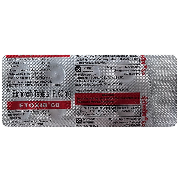 In Pain relief Etoxib 60 Tablet is used for short-term relief of pain, inflammation, and swelling in conditions that affect joints and muscles. It works by blocking chemical messengers in the brain that tell us we have pain. It can help relieve pain in conditions like rheumatoid arthritis and osteoarthritis or even after a dental (tooth-related) surgery. Take it as it is prescribed to get the most benefit. Do not take more or for longer than needed as that can be dangerous. In general, you should take the lowest dose that works, for the shortest possible time. This will help you to go about your daily activities more easily and have a better, more active, quality of life.