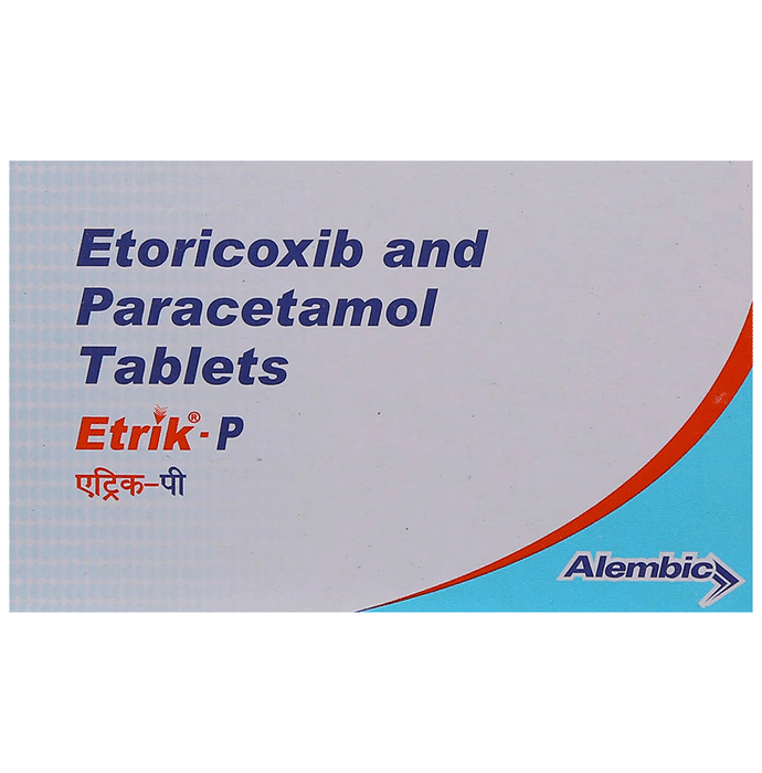 Etrik P Tablet is a pain-relieving medicine. It is used to reduce pain and inflammation in conditions like rheumatoid arthritis, ankylosing spondylitis, and osteoarthritis. It may also be used to relieve muscle pain, back pain, toothache, or pain in the ear and throat. Etrik P Tablet can be taken with or without food. You should take it regularly as advised by your doctor. Your doctor may change the dose and time between doses according to your pain level and your needs. Do not take more or use it for a longer duration than recommended by your doctor. Some of the common side effects of this medicine include diarrhea, indigestion, stomach pain, flatulence, swelling of hands and feet, and flu-like symptoms. If any of these side effects bother you or do not go away with time, you should let your doctor know. Your doctor may help with ways to reduce or prevent these side effects by prescribing an alternative medicine or adjusting the dose. The medicine may not be suitable for everybody. Before taking it, let your doctor know if you have any problems with your heart, kidneys, liver, or have stomach ulcers. To make sure it is safe for you, let your doctor know about all the other medicines you are taking. Pregnant and breastfeeding mothers should first consult their doctors before using this medicine.