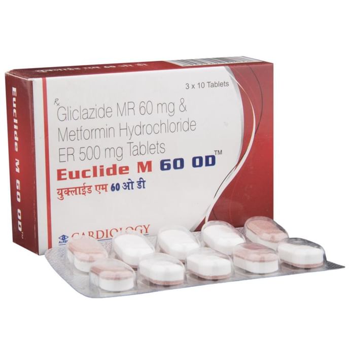 Euclide M 60 OD Tablet ER belongs to a category of medicines known as anti-diabetic drugs. It is a combination of two medicines used to treat type 2 diabetes mellitus in adults. It helps control blood sugar levels in people with diabetes. Euclide M 60 OD Tablet ER should be taken with food. Take it regularly at the same time each day to get the most benefit. Your doctor will decide what dose is best for you and this may change from time to time according to how it is working according to your blood sugar levels. Keep taking this medicine, even if you feel well or your blood sugar levels are controlled. If you stop it without consulting your doctor, your blood sugar levels could rise and put you at risk of kidney damage, blindness, nerve problems and loss of limbs. Remember that it is only part of a treatment program that should also include a healthy diet, regular exercise, and weight reduction as advised by your doctor. Your lifestyle plays a big part in controlling diabetes. The most common side effect of Euclide M 60 OD Tablet ER is low blood glucose levels (hypoglycemia). Make sure you recognize the signs of having low blood glucose levels, such as sweating, dizziness, headache, and shaking and know how to deal with it. To prevent this, it's important to have regular meals and always carry a fast-acting source of glucose such as sugary food or fruit juice with you. Drinking alcohol can also increase your risk of low blood sugar levels and should be avoided. Other side effects that may be seen on taking this medicine include taste changes, nausea, diarrhea, stomach pain, headache, and upper respiratory tract infection. Some people may find that they put on weight with this medicine. You should not take it if you have type 1 diabetes mellitus, if you have diabetic ketoacidosis (high levels of acid in your blood), or if you have severe kidney or liver disease. Before taking this medicine, tell your doctor if you have ever had heart disease. It may not be suitable. Pregnant or breastfeeding women should also consult their doctor before taking it. Your blood sugar levels should be checked regularly and your doctor may also advise blood tests to monitor your blood cell counts and liver function.