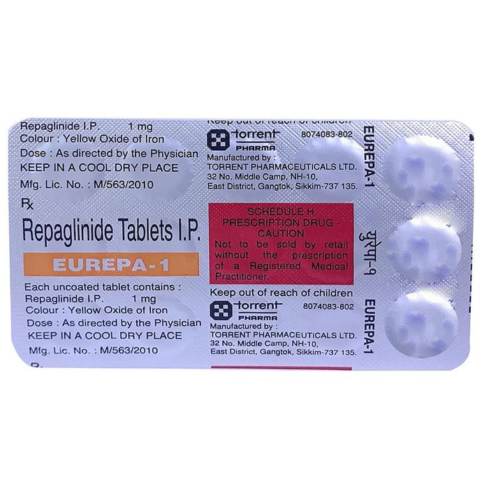 Eurepa 1 Tablet is used to lower blood sugar levels in adults with type 2 diabetes mellitus. It is usually prescribed along with other diabetes medicines to achieve adequate blood sugar control. It also prevents serious complications of diabetes like kidney damage and blindness. Eurepa 1 Tablet is normally prescribed when diet and exercise alone or other medicines have not been enough to control your blood sugar level. It works best when taken before meals. The dose will depend on your condition, and blood sugar levels, but you should take it as advised by your doctor. Take Eurepa 1 Tablet regularly, at the same time each day, to get the most benefit and you should not stop unless your doctor recommends it. It is controlling your blood sugar levels and helping to prevent serious complications in the future. It is important to stay on the diet and exercise program recommended by your doctor while taking this medicine. Your lifestyle plays a big part in controlling diabetes. The most common side effect of taking this medicine is hypoglycemia (low blood sugar levels). You can carry sugar or glucose candy to control low blood sugar levels. Other common side effects that may be seen while taking this medicine include abdominal pain and diarrhea. Contact your doctor if the side effects worry you or if they do not go away. Before taking this medicine, let your doctor know if you have ever had kidney disease, heart or pancreas problems, or if you drink a lot of alcohol. Pregnant or breastfeeding women should also consult their doctor before taking it. Some other medicines you are taking may interfere with it so make sure your doctor knows about all the other medicines you are taking. Limit your alcohol intake while taking this medicine because it can increase your risk of developing low blood sugar levels. You may need regular tests such as kidney function and blood glucose levels to check that the medicine is working properly.