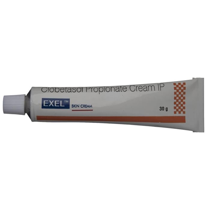 Exel skin Cream belongs to a group of medicines called steroids. It is used to treat various skin conditions such as dermatitis, eczema, and allergies. It works by reducing swelling, redness, and itchiness of the skin and prevents further irritation. Exel skin Cream is meant for external use and is to be used only as advised by your doctor. Wash and dry the affected area before applying a thin layer of the medicine. Avoid any contact with your eyes, nose, or mouth. Rinse it off with plenty of water if you accidentally get it in these areas. Avoid covering the treated area with airtight dressings such as bandages unless directed by a doctor. Using the medicine may cause skin thinning, burning sensation, irritation, redness, and swelling at the site of application. These are temporary and usually resolve with time. However, if they persist or worsen, let your doctor know. Exel skin Cream is not recommended to be used in children. Pregnant and breastfeeding mothers should consult their doctors before using this medicine.