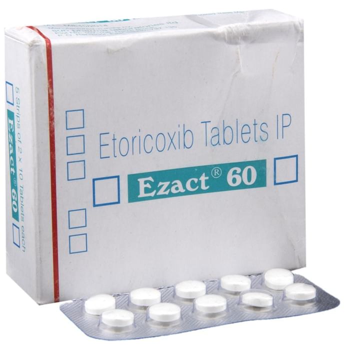 Ezact 60 Tablet is a pain-relieving medicine. It is used for relieving moderate pain and swelling of joints associated with different forms of gout and arthritis. It is also used for short-term treatment of moderate pain after dental surgery in people 16 years of age and older. Ezact 60 Tablet can be taken with or without food. The dose depends on what you are taking it for and how well it helps your symptoms. You should take it as advised by your doctor. Do not take more or use it for longer than recommended. The most common side effects of this medicine include stomach pain, edema, dizziness, headache, irregular heartbeat, and increased blood pressure. These are not usually serious but if you are worried, ask your doctor about ways of reducing or preventing them. Before taking it, you should let your doctor know if you have a history of ulcer or bleeding in your stomach, high blood pressure, or have any trouble with your heart, kidneys, or liver. Let your doctor also know about all the other medicines you are taking because they may affect, or be affected by, this medicine. Pregnant or breastfeeding women should consult their doctor before starting treatment. You should also avoid drinking alcohol while you are taking this medicine. Heavy drinking can cause excessive drowsiness.