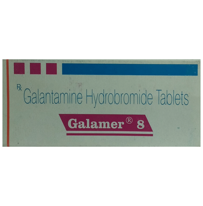 Galamer 8 Tablet is used to treat mild to moderate dementia in Alzheimer’s disease, a progressive illness that gradually affects memory and thinking. It does not cure this illness but may help improve memory, awareness, and other symptoms. Your doctor will explain how to take Galamer 8 Tablet. Follow the instructions carefully to get the most benefit. The dose may change from time to time to suit your individual needs. You may take it with food, preferably at night before going to bed. It can take up to a few weeks for symptoms to improve so keep taking your medicine regularly. You should not stop taking this medicine without consulting your doctor. The most common side effects of this medicine are nausea and vomiting. It may also cause diarrhea, decreased appetite, hallucination, depression, fainting, dizziness, headache, sleepiness, fatigue, indigestion, and abdominal pain. Some people may experience dizziness, increase in blood pressure, or slow heart rate. You may have side effects more often when you start your treatment or when your dose is increased. Usually, the side effects will slowly go away as your body gets used to the Galamer 8 Tablet. If they are severe or will not go away, you should contact your doctor. Before using Galamer 8 Tablet, you should tell your doctor if you have ever had heart problems, stomach ulcers, epilepsy, or asthma. It may also affect, or be affected by, some other drugs you are using so let your doctor know what these are to be safe. During pregnancy, this medicine should only be taken if it is advised.