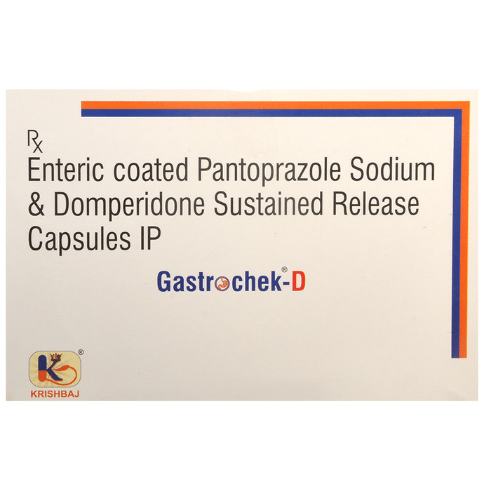 Gastrochek D 30mg/40mg Capsule is a prescription medicine used to treat gastroesophageal reflux disease (Acid reflux) and peptic ulcer disease by relieving the symptoms of acidity such as indigestion, heartburn, stomach pain, or irritation. Gastrochek D 30mg/40mg Capsule also neutralizes the acid in the stomach and promotes easy passage of gas to reduce stomach discomfort. It is taken without food in a dose and duration as advised by the doctor. The dose you are given will depend on your condition and how you respond to the medicine. You should keep taking this medicine for as long as your doctor recommends. If you stop treatment too early your symptoms may come back and your condition may worsen. Let your healthcare team know about all other medications you are taking as some may affect, or be affected by this medicine. The most common side effects are diarrhea, stomach pain, flatulence, dryness in the mouth, and headache. Most of these are temporary and usually resolve with time. Contact your doctor straight away if you are at all concerned about any of these side effects. This medicine may cause dizziness and sleepiness, so do not drive or do anything that requires mental focus until you know how this medicine affects you. Avoid drinking alcohol while taking this medicine as it can worsen your sleepiness. Lifestyle modifications like having cold milk and avoiding hot tea, coffee, spicy food, or chocolate can help you to get better results. Before you start taking this medicine it is important to inform your doctor if you are suffering from kidney or liver disease. You should also tell your doctor if you are pregnant, planning pregnancy, or breastfeeding.