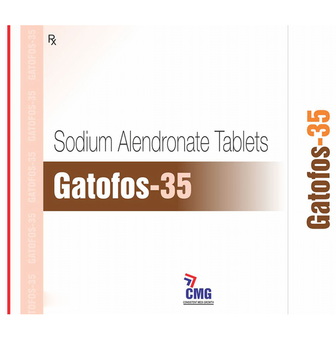 Gatofos 35 Tablet is used to treat or prevent weakening of the bones (osteoporosis) caused by menopause or use of steroids. Using this medicine can reduce your risk of breaking bones. Gatofos 35 Tablet is best taken without food. You should take it regularly at evenly spaced intervals as per the schedule prescribed by your doctor. Taking it at the same time every day will help you to remember to take it. Do not stop taking it until you have finished, even when you feel better. It may take several days to get the full benefit of this drug. Gatofos 35 Tablet is only part of a program of treatment that may also include changes to your diet and taking calcium and vitamin supplements. The most common side effects include headache, musculoskeletal (bone, muscle or joint) pain, indigestion, heartburn, and diarrhea. These are usually mild and will disappear after a short time. If they do not go away, tell your doctor. Gatofos 35 Tablet can cause serious kidney problems, especially if you are dehydrated, if you take diuretic medicine (water pills), or if you already have kidney disease. It can also cause low levels of calcium in the blood and pain in the mouth or jaw. These are serious side effects and need urgent medical attention. Tell your doctor straight away. You should not be given this medicine if you are breastfeeding. Before taking it, tell your doctor if you have kidney problems or low calcium levels. Also, let your doctor know what other drugs you are taking. Some of them may affect or be affected by, this medicine, especially medicines used to treat severe infections and osteoporosis. You may need frequent medical tests to check your kidney function and mineral levels. Avoid smoking or try to quit as smoking can reduce your bone mineral density, making fractures more likely. Drinking large amounts of alcohol can also cause bone loss and should be avoided.