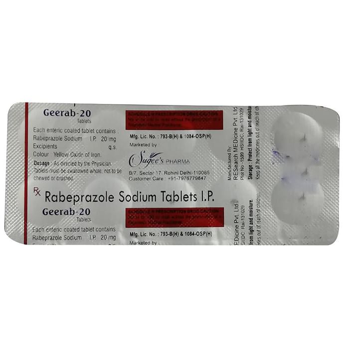 Geerab 20 Tablet is a medicine that reduces the amount of acid produced in your stomach. It is used for treating acid-related diseases of the stomach and intestine such as acid reflux, peptic ulcer disease, and some other stomach conditions associated with excessive acid production. Geerab 20 Tablet is also used to prevent stomach ulcers and acidity that may be seen with the prolonged use of painkillers. It belongs to a class of medicines known as proton pump inhibitors (PPIs). This medicine should be taken one hour before a meal, preferably in the morning. The dose will depend on your underlying condition and how you respond to the medicine. Try to take it regularly at the same time each day as advised by your doctor. You should keep on taking it as prescribed even if your symptoms disappear quickly. You may be able to help improve your symptoms by eating smaller meals more often and avoiding caffeinated drinks like tea and coffee, and spicy or fatty foods. This medicine's most common side effects include nausea, vomiting, headache, dizziness, flatulence, diarrhea, and stomach pain. These tend to be mild but talk to your doctor if they bother you or do not go away. The risk of side effects may increase the longer you take this medicine. Long-term use (more than 1 year) may increase your risk for bone fractures, especially with higher doses. Talk to your doctor about ways to prevent bone loss (osteoporosis), like taking calcium and vitamin D supplements. Low blood magnesium levels (hypomagnesemia) have been seen in some people taking this medicine for 3 months or more. This may lead to tiredness, confusion, dizziness, muscle twitches, and an irregular heartbeat. Your doctor may monitor your magnesium levels to prevent this. Geerab 20 Tablet is not suitable for some people. Before taking this medicine, you need to tell your doctor if you have severe liver problems, are taking medicines for HIV, have ever had an allergic reaction to similar medicines in the past, or suffer from bone loss (osteoporosis). Pregnant or breastfeeding women should also consult their doctor before taking it. Avoid drinking alcohol as it makes your stomach produce excessive acid and can worsen your symptoms. Do not drive or use machinery or tools, if this medicine makes you feel dizzy or sleepy.