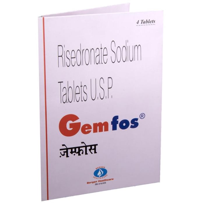 Gemfos Tablet is used to treat or prevent weakening of the bones (osteoporosis) caused by menopause or use of steroids. Using this medicine can reduce your risk of breaking bones. Gemfos Tablet is best taken without food. You should take it regularly at evenly spaced intervals as per the schedule prescribed by your doctor. Taking it at the same time every day will help you to remember to take it. Do not stop taking it until you have finished, even when you feel better. It may take several days to get the full benefit of this drug. Gemfos Tablet is only part of a program of treatment that may also include changes to your diet and taking calcium and vitamin supplements. The most common side effects include headache, musculoskeletal (bone, muscle or joint) pain, indigestion, heartburn, and diarrhea. These are usually mild and will disappear after a short time. If they do not go away, tell your doctor. Gemfos Tablet can cause serious kidney problems, especially if you are dehydrated, if you take diuretic medicine (water pills), or if you already have kidney disease. It can also cause low levels of calcium in the blood and pain in the mouth or jaw. These are serious side effects and need urgent medical attention. Tell your doctor straight away. You should not be given this medicine if you are breastfeeding. Before taking it, tell your doctor if you have kidney problems or low calcium levels. Also, let your doctor know what other drugs you are taking. Some of them may affect, or be affected by, this injection, especially medicines used to treat severe infections and medicines used to treat cancer and osteoporosis. You may need frequent medical tests to check your kidney function and mineral levels. Avoid smoking or try to quit as smoking can reduce your bone mineral density, making fractures more likely. Drinking large amounts of alcohol can also cause bone loss and should be avoided.