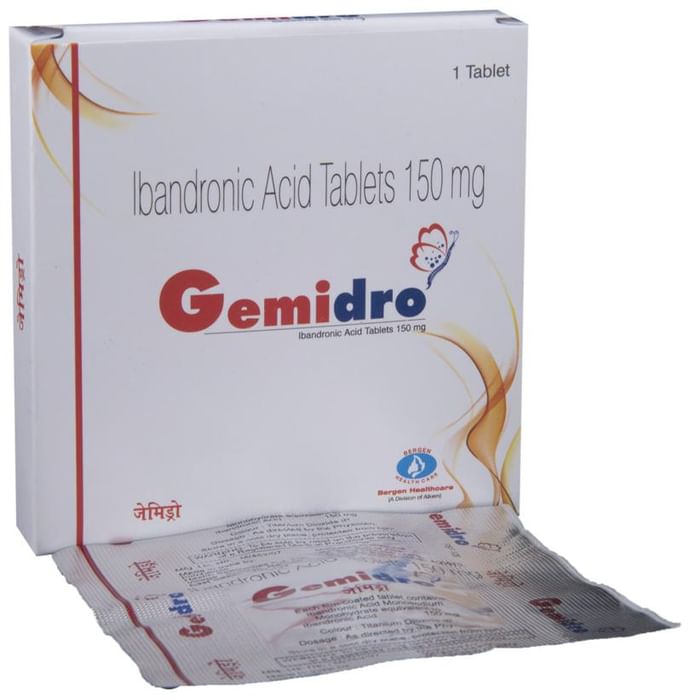 Gemidro Tablet is used to treat or prevent weakening of the bones (osteoporosis) caused by menopause or use of steroids. Using this medicine can reduce your risk of breaking bones. Gemidro Tablet is best taken without food. You should take it regularly at evenly spaced intervals as per the schedule prescribed by your doctor. Taking it at the same time every day will help you to remember to take it. Do not stop taking it until you have finished, even when you feel better. It may take several days to get the full benefit of this drug. Gemidro Tablet is only part of a program of treatment that may also include changes to your diet and taking calcium and vitamin supplements. The most common side effects include headache, musculoskeletal (bone, muscle or joint) pain, indigestion, heartburn, and diarrhea. These are usually mild and will disappear after a short time. If they do not go away, tell your doctor. Gemidro Tablet can cause serious kidney problems, especially if you are dehydrated, if you take diuretic medicine (water pills), or if you already have kidney disease. It can also cause low levels of calcium in the blood and pain in the mouth or jaw. These are serious side effects and need urgent medical attention. Tell your doctor straight away. You should not be given this medicine if you are breastfeeding. Before taking it, tell your doctor if you have kidney problems or low calcium levels. Also, let your doctor know what other drugs you are taking. Some of them may affect, or be affected by, this injection, especially medicines used to treat severe infections and medicines used to treat cancer and osteoporosis. You may need frequent medical tests to check your kidney function and mineral levels. Avoid smoking or try to quit as smoking can reduce your bone mineral density, making fractures more likely. Drinking large amounts of alcohol can also cause bone loss and should be avoided.
