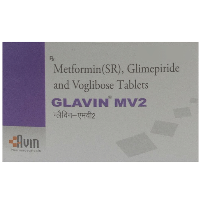 Glavin MV 2 Tablet SR belongs to a category of medicines known as anti-diabetic drugs. It is a combination of medicines used to treat type 2 diabetes mellitus in adults. It helps control blood sugar levels in people with diabetes. Glavin MV 2 Tablet SR should be taken with food. Take it regularly at the same time each day to get the most benefit. Your doctor will decide what dose is best for you and this may change from time to time according to how it is working according to your blood sugar levels. Keep taking this medicine, even if you feel well or your blood sugar levels are controlled. If you stop it without consulting your doctor, your blood sugar levels could rise and put you at risk of kidney damage, blindness, nerve problems and loss of limbs. Remember that it is only part of a treatment program that should also include a healthy diet, regular exercise, and weight reduction as advised by your doctor. Your lifestyle plays a big part in controlling diabetes. The most common side effect of Glavin MV 2 Tablet SR is low blood glucose levels (hypoglycemia). Make sure you recognize the signs of having low blood glucose levels, such as sweating, dizziness, headache, and shaking and know how to deal with it. To prevent this, it's important to have regular meals and always carry a fast-acting source of glucose such as sugary food or fruit juice with you. Drinking alcohol can also increase your risk of low blood sugar levels and should be avoided. Other side effects that may be seen on taking this medicine include taste changes, nausea, diarrhea, stomach pain, headache, edema (swelling), blurred vision, bone fracture, and upper respiratory tract infection. Some people may find that they put on weight with this medicine. You should not take it if you have type 1 diabetes mellitus, if you have diabetic ketoacidosis (high levels of acid in your blood), or if you have severe kidney or liver disease. Before taking this medicine, tell your doctor if you have ever had heart disease. It may not be suitable. Pregnant or breastfeeding women should also consult their doctor before taking it. Your blood sugar levels should be checked regularly and your doctor may also advise blood tests to monitor your blood cell counts and liver function.