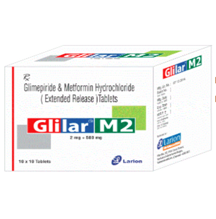 Glilar M2 Tablet ER belongs to a category of medicines known as anti-diabetic drugs. It is a combination of two medicines used to treat type 2 diabetes mellitus in adults. It helps control blood sugar levels in people with diabetes. Glilar M2 Tablet ER should be taken with food. Take it regularly at the same time each day to get the most benefit. Your doctor will decide what dose is best for you and this may change from time to time according to how it is working according to your blood sugar levels. Keep taking this medicine, even if you feel well or your blood sugar levels are controlled. If you stop it without consulting your doctor, your blood sugar levels could rise and put you at risk of kidney damage, blindness, nerve problems, and loss of limbs. Remember that it is only part of a treatment program that should also include a healthy diet, regular exercise, and weight reduction as advised by your doctor. Your lifestyle plays a big part in controlling diabetes. The most common side effect of Glilar M2 Tablet ER is low blood glucose levels (hypoglycemia). Make sure you recognize the signs of having low blood glucose levels, such as sweating, dizziness, headache, and shaking, and know how to deal with it. To prevent this, it's important to have regular meals and always carry a fast-acting source of glucose such as sugary food or fruit juice with you. Drinking alcohol can also increase your risk of low blood sugar levels and should be avoided. Other side effects that may be seen on taking this medicine include taste changes, nausea, diarrhea, stomach pain, headache, and upper respiratory tract infection. Some people may find that they put on weight with this medicine. You should not take it if you have type 1 diabetes mellitus, if you have diabetic ketoacidosis (high levels of acid in your blood), or if you have severe kidney or liver disease. Before taking this medicine, tell your doctor if you have ever had heart disease. It may not be suitable. Pregnant or breastfeeding women should also consult their doctor before taking it. Your blood sugar levels should be checked regularly and your doctor may also advise blood tests to monitor your blood cell counts and liver function.