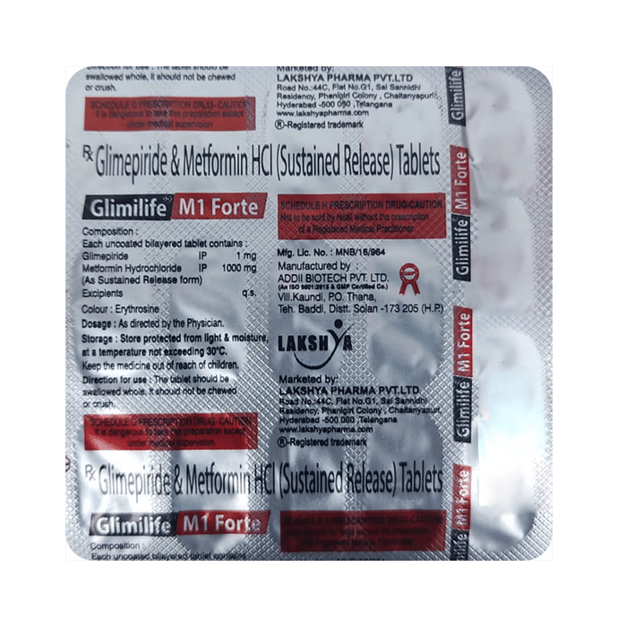 Glimilife M1 Forte Tablet SR belongs to a category of medicines known as anti-diabetic drugs. It is a combination of two medicines used to treat type 2 diabetes mellitus in adults. It helps control blood sugar levels in people with diabetes. Glimilife M1 Forte Tablet SR should be taken with food. Take it regularly at the same time each day to get the most benefit. Your doctor will decide what dose is best for you and this may change from time to time according to how it is working according to your blood sugar levels. Keep taking this medicine, even if you feel well or your blood sugar levels are controlled. If you stop it without consulting your doctor, your blood sugar levels could rise and put you at risk of kidney damage, blindness, nerve problems, and loss of limbs. Remember that it is only part of a treatment program that should also include a healthy diet, regular exercise, and weight reduction as advised by your doctor. Your lifestyle plays a big part in controlling diabetes. The most common side effect of Glimilife M1 Forte Tablet SR is low blood glucose levels (hypoglycemia). Make sure you recognize the signs of having low blood glucose levels, such as sweating, dizziness, headache, and shaking, and know how to deal with it. To prevent this, it's important to have regular meals and always carry a fast-acting source of glucose such as sugary food or fruit juice with you. Drinking alcohol can also increase your risk of low blood sugar levels and should be avoided. Other side effects that may be seen on taking this medicine include taste changes, nausea, diarrhea, stomach pain, headache, and upper respiratory tract infection. Some people may find that they put on weight with this medicine. You should not take it if you have type 1 diabetes mellitus, if you have diabetic ketoacidosis (high levels of acid in your blood), or if you have severe kidney or liver disease. Before taking this medicine, tell your doctor if you have ever had heart disease. It may not be suitable. Pregnant or breastfeeding women should also consult their doctor before taking it. Your blood sugar levels should be checked regularly and your doctor may also advise blood tests to monitor your blood cell counts and liver function.
