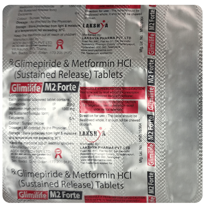 Glimilife M2 Forte Tablet SR belongs to a category of medicines known as anti-diabetic drugs. It is a combination of two medicines used to treat type 2 diabetes mellitus in adults. It helps control blood sugar levels in people with diabetes. Glimilife M2 Forte Tablet SR should be taken with food. Take it regularly at the same time each day to get the most benefit. Your doctor will decide what dose is best for you and this may change from time to time according to how it is working according to your blood sugar levels. Keep taking this medicine, even if you feel well or your blood sugar levels are controlled. If you stop it without consulting your doctor, your blood sugar levels could rise and put you at risk of kidney damage, blindness, nerve problems, and loss of limbs. Remember that it is only part of a treatment program that should also include a healthy diet, regular exercise, and weight reduction as advised by your doctor. Your lifestyle plays a big part in controlling diabetes. The most common side effect of Glimilife M2 Forte Tablet SR is low blood glucose levels (hypoglycemia). Make sure you recognize the signs of having low blood glucose levels, such as sweating, dizziness, headache, and shaking, and know how to deal with it. To prevent this, it's important to have regular meals and always carry a fast-acting source of glucose such as sugary food or fruit juice with you. Drinking alcohol can also increase your risk of low blood sugar levels and should be avoided. Other side effects that may be seen on taking this medicine include taste changes, nausea, diarrhea, stomach pain, headache, and upper respiratory tract infection. Some people may find that they put on weight with this medicine. You should not take it if you have type 1 diabetes mellitus, if you have diabetic ketoacidosis (high levels of acid in your blood), or if you have severe kidney or liver disease. Before taking this medicine, tell your doctor if you have ever had heart disease. It may not be suitable. Pregnant or breastfeeding women should also consult their doctor before taking it. Your blood sugar levels should be checked regularly and your doctor may also advise blood tests to monitor your blood cell counts and liver function.
