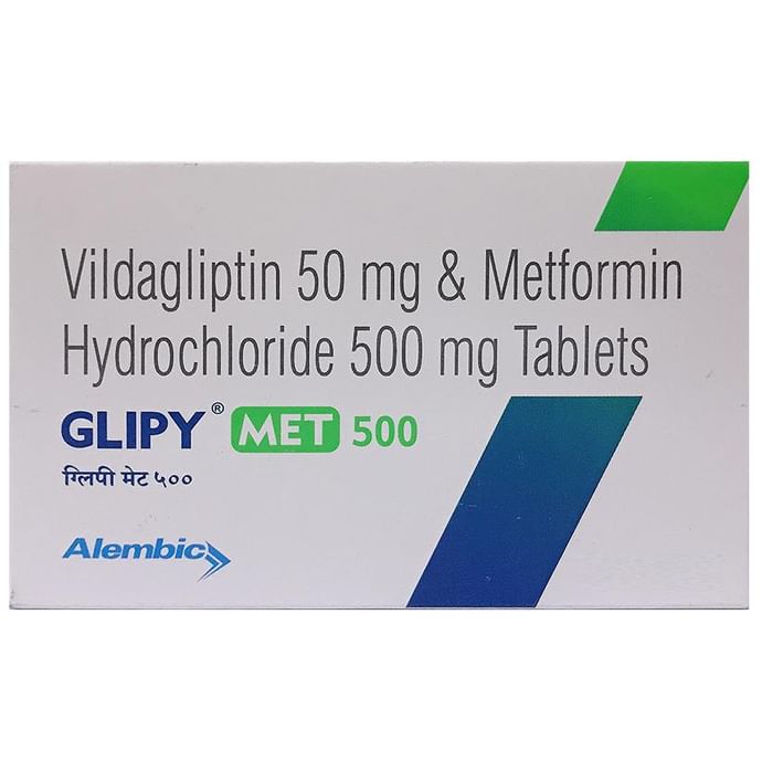 Glipy Met 500 Tablet is a combination of two medicines that control high blood sugar levels in people with type 2 diabetes mellitus. This helps prevent serious complications of diabetes such as kidney damage and blindness and may also reduce your chances of having a heart attack or stroke. Glipy Met 500 Tablet can be prescribed alone or together with other diabetes medications. All diabetes medicines work best when used along with a healthy diet and regular exercise. The dose you are given will depend on your condition, blood sugar levels, and what other medicines you are taking. Taking it with meals helps to reduce the chances of developing an upset stomach. You should take it regularly, at the same time each day, to get the most benefit and you should not stop unless your doctor recommends it. It is controlling your blood sugar levels and helping to prevent serious complications in the future. It is important to stay on the diet and exercise program recommended by your doctor while taking this medicine. Your lifestyle plays a big part in controlling diabetes. The most common side effects of taking this medicine include diarrhea, nausea, vomiting, upset stomach, headache, and sore throat. Low blood sugar level (hypoglycemia) is a possible side effect if you are also taking other diabetes medicines like insulin or sulphonylurea, so you need to know how to recognize and deal with it. This medicine is not suitable for everyone. Before taking it, you should let your doctor know if you have ever had kidney, liver, or heart disease, problems with your pancreas, or if you drink a lot of alcohol. Pregnant or breastfeeding women should also consult their doctor before taking this medicine. Some other medicines can affect this one so tell your doctor about all the medicines you are taking to make sure you are safe. You should try to avoid drinking alcohol as it lowers blood glucose. Your doctor will check your kidney function and blood sugar levels before and during treatment.