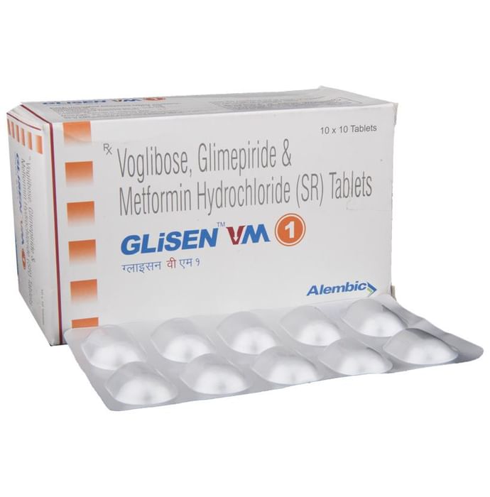 Glisen VM 1 Tablet SR belongs to a category of medicines known as anti-diabetic drugs. It is a combination of medicines used to treat type 2 diabetes mellitus in adults. It helps control blood sugar levels in people with diabetes. Glisen VM 1 Tablet SR should be taken with food. Take it regularly at the same time each day to get the most benefit. Your doctor will decide what dose is best for you and this may change from time to time according to how it is working according to your blood sugar levels. Keep taking this medicine, even if you feel well or your blood sugar levels are controlled. If you stop it without consulting your doctor, your blood sugar levels could rise and put you at risk of kidney damage, blindness, nerve problems and loss of limbs. Remember that it is only part of a treatment program that should also include a healthy diet, regular exercise, and weight reduction as advised by your doctor. Your lifestyle plays a big part in controlling diabetes. The most common side effect of Glisen VM 1 Tablet SR is low blood glucose levels (hypoglycemia). Make sure you recognize the signs of having low blood glucose levels, such as sweating, dizziness, headache, and shaking and know how to deal with it. To prevent this, it's important to have regular meals and always carry a fast-acting source of glucose such as sugary food or fruit juice with you. Drinking alcohol can also increase your risk of low blood sugar levels and should be avoided. Other side effects that may be seen on taking this medicine include taste changes, nausea, diarrhea, stomach pain, headache, edema (swelling), blurred vision, bone fracture, and upper respiratory tract infection. Some people may find that they put on weight with this medicine. You should not take it if you have type 1 diabetes mellitus, if you have diabetic ketoacidosis (high levels of acid in your blood), or if you have severe kidney or liver disease. Before taking this medicine, tell your doctor if you have ever had heart disease. It may not be suitable. Pregnant or breastfeeding women should also consult their doctor before taking it. Your blood sugar levels should be checked regularly and your doctor may also advise blood tests to monitor your blood cell counts and liver function.