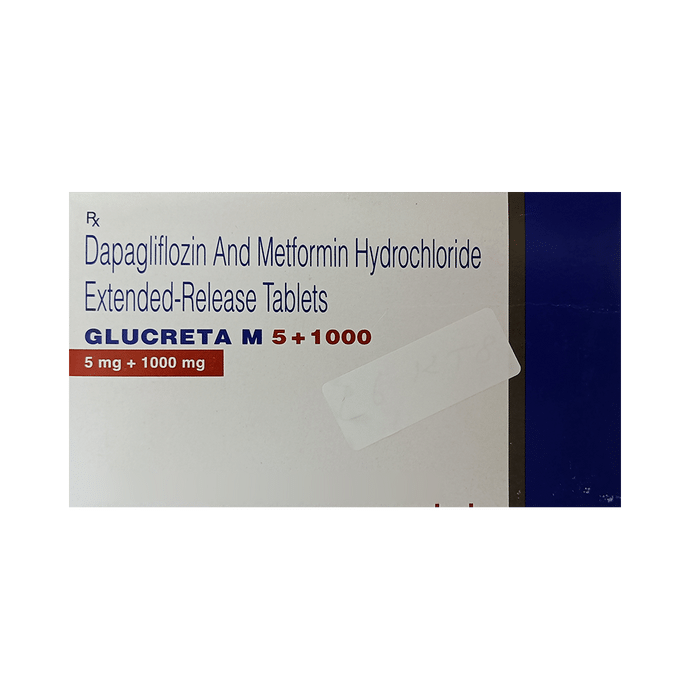 Glucreta M 5+1000 Tablet ER is a combination of two medicines used to treat type 2 diabetes mellitus. It helps control the high blood sugar levels seen in diabetes. This reduces the chances of serious complications of diabetes and also helps prevent heart disease. Glucreta M 5+1000 Tablet ER can be taken with or without food at any time of day but you should try to take it at the same time every day. The dose will be decided by your doctor. Don’t stop taking it without asking your doctor. If you do, your blood sugar levels may increase and put you at risk of serious complications like kidney damage and blindness. This medicine is only part of a treatment program that should include a healthy diet, regular exercise, and weight reduction as advised by your doctor. The most common side effects of this medicine include sore throat, nasal congestion, runny nose, headache, nausea, vomiting, and diarrhea. Drinking plenty of fluids while using it will help prevent dehydration. Some people may develop fungal infections in the genital area. Maintaining good hygiene can help prevent this. Before taking this medicine, inform your doctor if you have any kidney or liver problems or a urinary tract infection or if you are on water pills (diuretics). Pregnant or breastfeeding women should also consult their doctor before taking it. Avoid excessive alcohol intake while taking it as this may increase the risk of developing some side effects. Monitor your blood sugar levels regularly while taking this medicine.