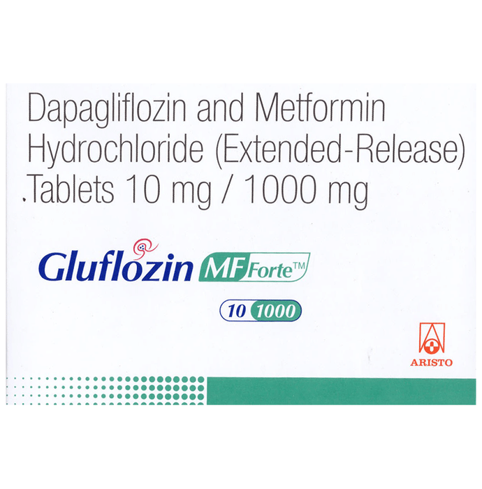 Gluflozin MF Forte 10/1000 Tablet ER is a combination of two medicines used to treat type 2 diabetes mellitus. It helps control the high blood sugar levels seen in diabetes. This reduces the chances of serious complications of diabetes and also helps prevent heart disease. Gluflozin MF Forte 10/1000 Tablet ER can be taken with or without food at any time of day but you should try to take it at the same time every day. The dose will be decided by your doctor. Don’t stop taking it without asking your doctor. If you do, your blood sugar levels may increase and put you at risk of serious complications like kidney damage and blindness. This medicine is only part of a treatment program that should include a healthy diet, regular exercise, and weight reduction as advised by your doctor. The most common side effects of this medicine include sore throat, nasal congestion, runny nose, headache, nausea, vomiting, and diarrhea. Drinking plenty of fluids while using it will help prevent dehydration. Some people may develop fungal infections in the genital area. Maintaining good hygiene can help prevent this. Before taking this medicine, inform your doctor if you have any kidney or liver problems or a urinary tract infection or if you are on water pills (diuretics). Pregnant or breastfeeding women should also consult their doctor before taking it. Avoid excessive alcohol intake while taking it as this may increase the risk of developing some side effects. Monitor your blood sugar levels regularly while taking this medicine.