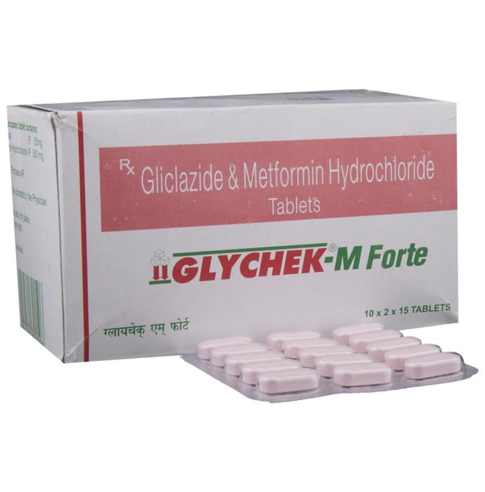 Glychek-M Forte Tablet belongs to a category of medicines known as anti-diabetic drugs. It is a combination of two medicines used to treat type 2 diabetes mellitus in adults. It helps control blood sugar levels in people with diabetes. Glychek-M Forte Tablet should be taken with food. Take it regularly at the same time each day to get the most benefit. Your doctor will decide what dose is best for you and this may change from time to time according to how it is working according to your blood sugar levels. Keep taking this medicine, even if you feel well or your blood sugar levels are controlled. If you stop it without consulting your doctor, your blood sugar levels could rise and put you at risk of kidney damage, blindness, nerve problems and loss of limbs. Remember that it is only part of a treatment program that should also include a healthy diet, regular exercise, and weight reduction as advised by your doctor. Your lifestyle plays a big part in controlling diabetes. The most common side effect of Glychek-M Forte Tablet is low blood glucose levels (hypoglycemia). Make sure you recognize the signs of having low blood glucose levels, such as sweating, dizziness, headache, and shaking and know how to deal with it. To prevent this, it's important to have regular meals and always carry a fast-acting source of glucose such as sugary food or fruit juice with you. Drinking alcohol can also increase your risk of low blood sugar levels and should be avoided. Other side effects that may be seen on taking this medicine include taste changes, nausea, diarrhea, stomach pain, headache, and upper respiratory tract infection. Some people may find that they put on weight with this medicine. You should not take it if you have type 1 diabetes mellitus, if you have diabetic ketoacidosis (high levels of acid in your blood), or if you have severe kidney or liver disease. Before taking this medicine, tell your doctor if you have ever had heart disease. It may not be suitable. Pregnant or breastfeeding women should also consult their doctor before taking it. Your blood sugar levels should be checked regularly and your doctor may also advise blood tests to monitor your blood cell counts and liver function.