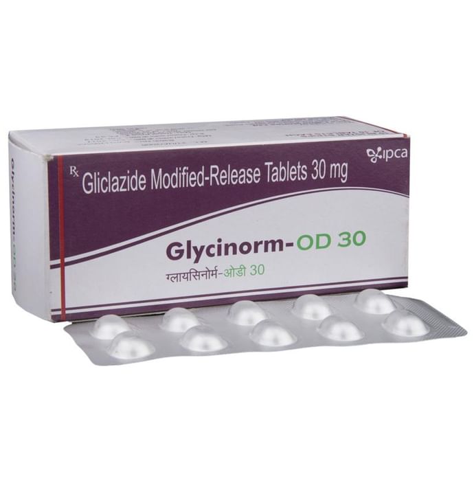 Glycinorm OD 30mg Tablet MR is a medicine used to treat type 2 diabetes mellitus in adults. It belongs to a group of medicines called sulfonylureas and helps control blood sugar levels in people with diabetes. This helps to prevent serious complications of diabetes like kidney damage and blindness. Glycinorm OD 30mg Tablet MR may be prescribed alone or along with other medicines. It should be taken with food. Take it regularly at the same time each day to get the most benefit. Your doctor will decide what dose is best for you and this may change from time to time according to how it works. Keep taking this medicine, even if you feel well or your blood sugar levels are controlled. If you stop it without consulting your doctor, your blood sugar levels could rise and put you at risk of kidney damage, blindness, nerve problems, and loss of limbs. Remember that it is only part of a treatment program that should also include a healthy diet, regular exercise, and weight reduction as advised by your doctor. Your lifestyle plays a big part in controlling diabetes. The most common side effects of taking this medicine include indigestion and stomach upsets. It can also cause low blood glucose levels (hypoglycemia). Make sure you recognize the signs of having low blood glucose levels, such as sweating, dizziness, headache, and shaking, and know how to deal with it. To prevent this, it's important to have regular meals and always carry a fast-acting source of glucose such as sugary food or fruit juice with you. Drinking alcohol can also increase your risk of low blood sugar levels and should be avoided. Some people may find that they put on weight with this medicine. You should not take it if you have type 1 diabetes mellitus, if you have diabetic ketoacidosis (high levels of acid in your blood), or if you have severe kidney or liver disease. Before taking this medicine, tell your doctor if you have ever had heart disease, thyroid disease, or some hormonal conditions. It may not be suitable. Pregnant or breastfeeding women should also consult their doctor before taking it. Your blood sugar levels should be checked regularly and your doctor may also advise blood tests to monitor your blood cell counts and liver function.