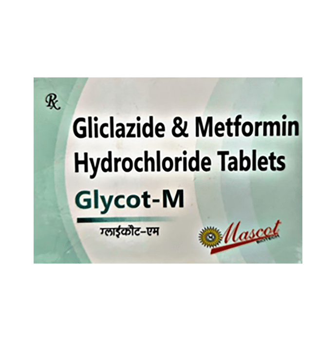 Glycot-M Tablet belongs to a category of medicines known as anti-diabetic drugs. It is a combination of two medicines used to treat type 2 diabetes mellitus in adults. It helps control blood sugar levels in people with diabetes. Glycot-M Tablet should be taken with food. Take it regularly at the same time each day to get the most benefit. Your doctor will decide what dose is best for you and this may change from time to time according to how it is working according to your blood sugar levels. Keep taking this medicine, even if you feel well or your blood sugar levels are controlled. If you stop it without consulting your doctor, your blood sugar levels could rise and put you at risk of kidney damage, blindness, nerve problems and loss of limbs. Remember that it is only part of a treatment program that should also include a healthy diet, regular exercise, and weight reduction as advised by your doctor. Your lifestyle plays a big part in controlling diabetes. The most common side effect of Glycot-M Tablet is low blood glucose levels (hypoglycemia). Make sure you recognize the signs of having low blood glucose levels, such as sweating, dizziness, headache, and shaking and know how to deal with it. To prevent this, it's important to have regular meals and always carry a fast-acting source of glucose such as sugary food or fruit juice with you. Drinking alcohol can also increase your risk of low blood sugar levels and should be avoided. Other side effects that may be seen on taking this medicine include taste changes, nausea, diarrhea, stomach pain, headache, and upper respiratory tract infection. Some people may find that they put on weight with this medicine. You should not take it if you have type 1 diabetes mellitus, if you have diabetic ketoacidosis (high levels of acid in your blood), or if you have severe kidney or liver disease. Before taking this medicine, tell your doctor if you have ever had heart disease. It may not be suitable. Pregnant or breastfeeding women should also consult their doctor before taking it. Your blood sugar levels should be checked regularly and your doctor may also advise blood tests to monitor your blood cell counts and liver function.