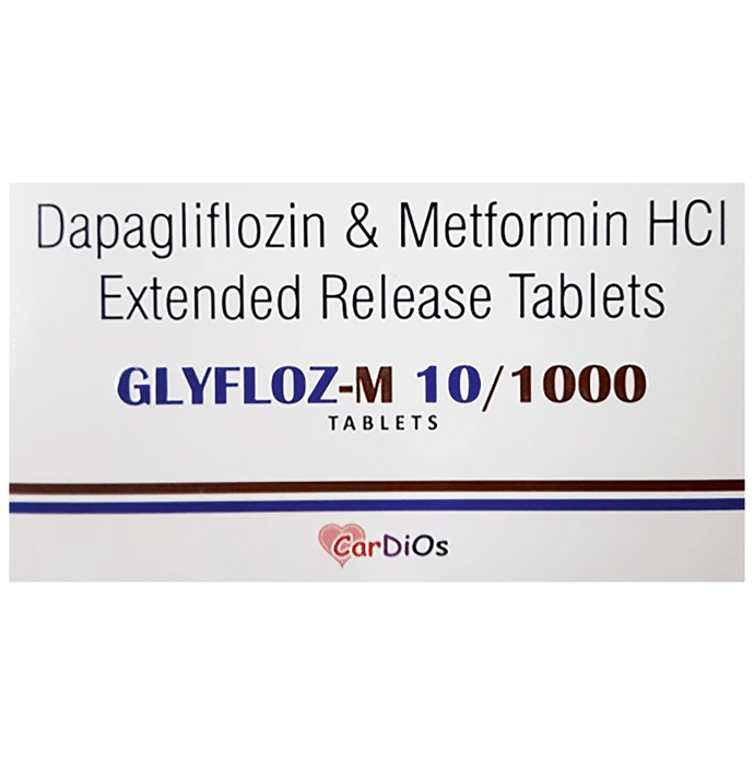 Glyfloz-M 10/1000 Tablet ER is a combination of two medicines used to treat type 2 diabetes mellitus. It helps control the high blood sugar levels seen in diabetes. This reduces the chances of serious complications of diabetes and also helps prevent heart disease. Glyfloz-M 10/1000 Tablet ER can be taken with or without food at any time of day but you should try to take it at the same time every day. The dose will be decided by your doctor. Don’t stop taking it without asking your doctor. If you do, your blood sugar levels may increase and put you at risk of serious complications like kidney damage and blindness. This medicine is only part of a treatment program that should include a healthy diet, regular exercise, and weight reduction as advised by your doctor. The most common side effects of this medicine include sore throat, nasal congestion, runny nose, headache, nausea, vomiting, and diarrhea. Drinking plenty of fluids while using it will help prevent dehydration. Some people may develop fungal infections in the genital area. Maintaining good hygiene can help prevent this. Before taking this medicine, inform your doctor if you have any kidney or liver problems or a urinary tract infection or if you are on water pills (diuretics). Pregnant or breastfeeding women should also consult their doctor before taking it. Avoid excessive alcohol intake while taking it as this may increase the risk of developing some side effects. Monitor your blood sugar levels regularly while taking this medicine.
