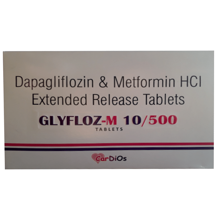 Glyfloz-M 10/500 Tablet ER is a combination of two medicines used to treat type 2 diabetes mellitus. It helps control the high blood sugar levels seen in diabetes. This reduces the chances of serious complications of diabetes and also helps prevent heart disease. Glyfloz-M 10/500 Tablet ER can be taken with or without food at any time of day but you should try to take it at the same time every day. The dose will be decided by your doctor. Don’t stop taking it without asking your doctor. If you do, your blood sugar levels may increase and put you at risk of serious complications like kidney damage and blindness. This medicine is only part of a treatment program that should include a healthy diet, regular exercise, and weight reduction as advised by your doctor. The most common side effects of this medicine include sore throat, nasal congestion, runny nose, headache, nausea, vomiting, and diarrhea. Drinking plenty of fluids while using it will help prevent dehydration. Some people may develop fungal infections in the genital area. Maintaining good hygiene can help prevent this. Before taking this medicine, inform your doctor if you have any kidney or liver problems or a urinary tract infection or if you are on water pills (diuretics). Pregnant or breastfeeding women should also consult their doctor before taking it. Avoid excessive alcohol intake while taking it as this may increase the risk of developing some side effects. Monitor your blood sugar levels regularly while taking this medicine.