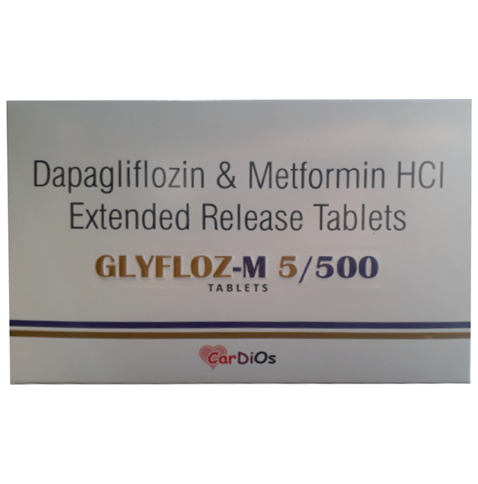 Glyfloz-M 5mg/500mg Tablet ER is a combination of two medicines used to treat type 2 diabetes mellitus. It helps control the high blood sugar levels seen in diabetes. This reduces the chances of serious complications of diabetes and also helps prevent heart disease. Glyfloz-M 5mg/500mg Tablet ER can be taken with or without food at any time of day but you should try to take it at the same time every day. The dose will be decided by your doctor. Don’t stop taking it without asking your doctor. If you do, your blood sugar levels may increase and put you at risk of serious complications like kidney damage and blindness. This medicine is only part of a treatment program that should include a healthy diet, regular exercise, and weight reduction as advised by your doctor. The most common side effects of this medicine include sore throat, nasal congestion, runny nose, headache, nausea, vomiting, and diarrhea. Drinking plenty of fluids while using it will help prevent dehydration. Some people may develop fungal infections in the genital area. Maintaining good hygiene can help prevent this. Before taking this medicine, inform your doctor if you have any kidney or liver problems or a urinary tract infection or if you are on water pills (diuretics). Pregnant or breastfeeding women should also consult their doctor before taking it. Avoid excessive alcohol intake while taking it as this may increase the risk of developing some side effects. Monitor your blood sugar levels regularly while taking this medicine.