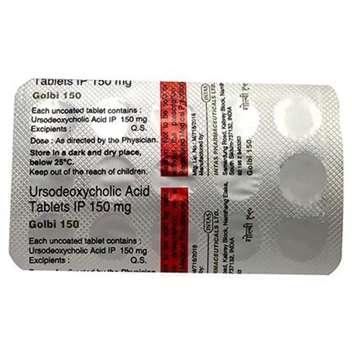Golbi 150 Tablet is used to dissolve certain gallstones and prevent them from forming. It is also used to treat a type of liver disease called primary biliary cirrhosis. It helps break down the cholesterol that has converted into stones in your gallbladder thereby dissolving the stones. Golbi 150 Tablet should be swallowed whole after a meal and with a glass of milk or water. The dose will depend on what you are being treated for and your body weight. Take it regularly to get maximum benefit and keep taking it for as long as prescribed (several months or longer). Keep taking it even if your symptoms disappear. This medicine's most common side effects are abdominal pain, diarrhea, hair loss, itching, nausea, and rash. Not everyone gets these side effects. If you are worried about them, or they do not go away, let your doctor know. Before taking this medicine, you should tell your doctor if you have an inflammation of the gallbladder or bile ducts, you get frequent cramp-like pain in your upper abdomen, you have been coughing up blood or you have gained weight rapidly. Using this medicine can reduce or increase the effect of some other medicines so tell your doctor all other medicines you are taking. Women should discontinue hormonal birth control pills as they can increase the production of gallstones. During the treatment, you may need ultrasound scans, or frequent blood tests to check your liver function.