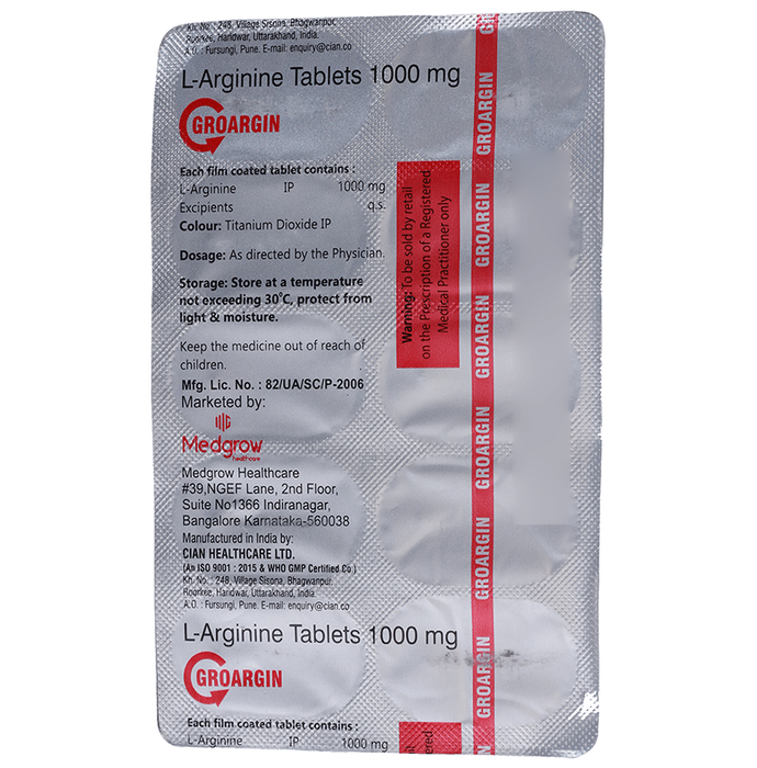 Groargin Tablet is a non-essential amino acid. It is used in the treatment of nutritional deficiencies. It helps to improve vascular and heart health. Additionally, it promotes muscle growth, thus can also be used for bodybuilding. Groargin Tablet should be taken in the dose and duration as advised by the doctor. An overdose of this medicine may have harmful effects on your health. It can be taken with or without food. This medicine is usually safe, however, it may cause nausea, bloating, and diarrhea, etc. as side effects. Some people may also experience low blood pressure after taking the medicine. Patients with a history of acute heart disease should take this medicine only when prescribed by the doctor. During the course of the treatment, your doctor may suggest some diagnostic and laboratory (blood and urine) tests to know the effects of the medicine on the body.